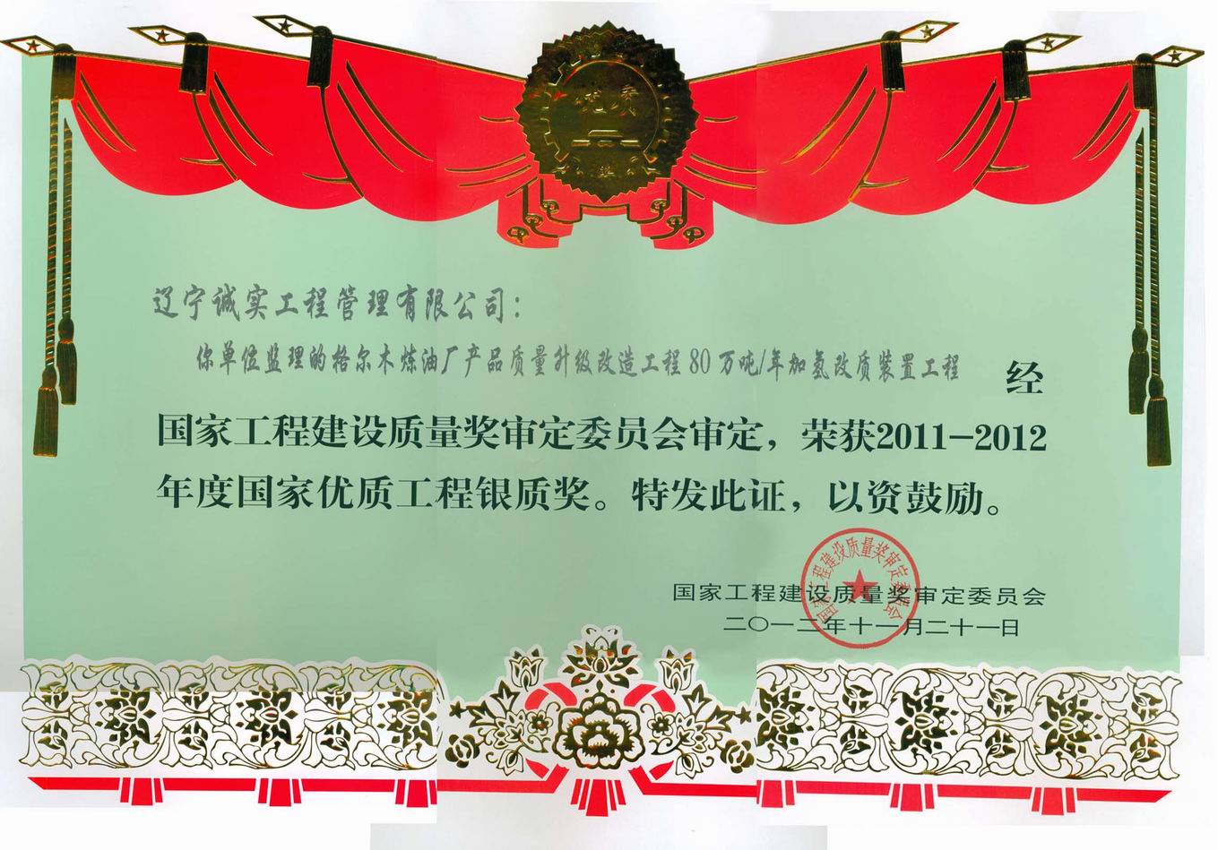 2011-2012年國家優(yōu)質(zhì)工程銀質(zhì)獎(格爾木煉油廠)